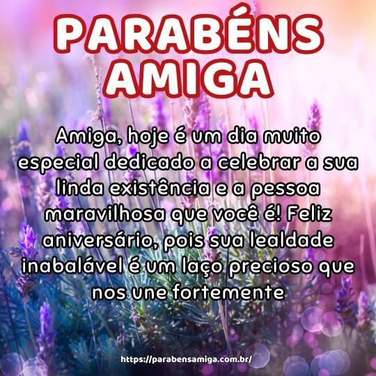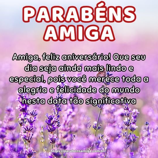 Amiga, parabéns por este dia esplêndido que marca mais um ano da sua linda vida! Que a felicidade te abrace com muito carinho e te envolva em um manto de alegria duradoura, pois sua amizade sincera me conforta.