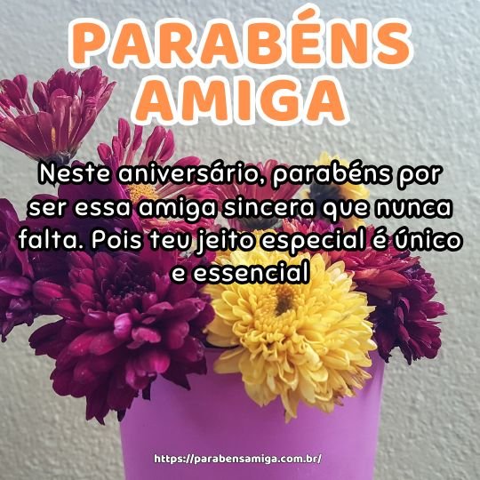 Parabéns, amiga! Pois tua companhia verdadeira alegra meus dias e torna cada aniversário um momento de celebração real.